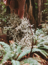 Northwest rainforest: giant ferns, moss, fungi, ocean. Damp usnea, mushroom umbrellas, spores, emerald carpet, earth anemones.